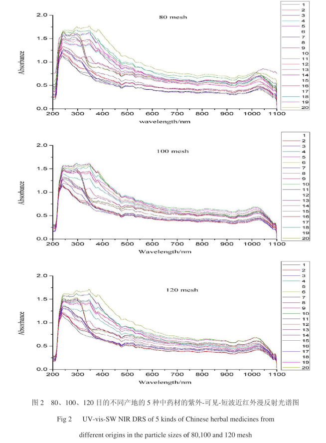 中药材的伪品、混淆品直接影响中药的质量。因此,中药质量的可控性研究是中医药界关注的焦点。中药材鉴别是中药质量标准的核心部分,传统的鉴别分析方法需要对样品进行复杂的预处理,分析过程繁琐且耗时较长。近年来,近红外光谱法结合化学计量学,被广泛应用于快速鉴别外形相近的中药材的真伪、产地、种类和质量控制,逐步发展成为一门快速、高效、无需预处理、无损、便于在线分析的检测技术17。相比之下,紫外-可见-短波近红外光谱法作为快速、无损分析技术虽然在催化材料、土壤、癌症原位诊断的许多方面有众多的应用,然而,鲜有在中药材鉴别上的研究及应用报道。